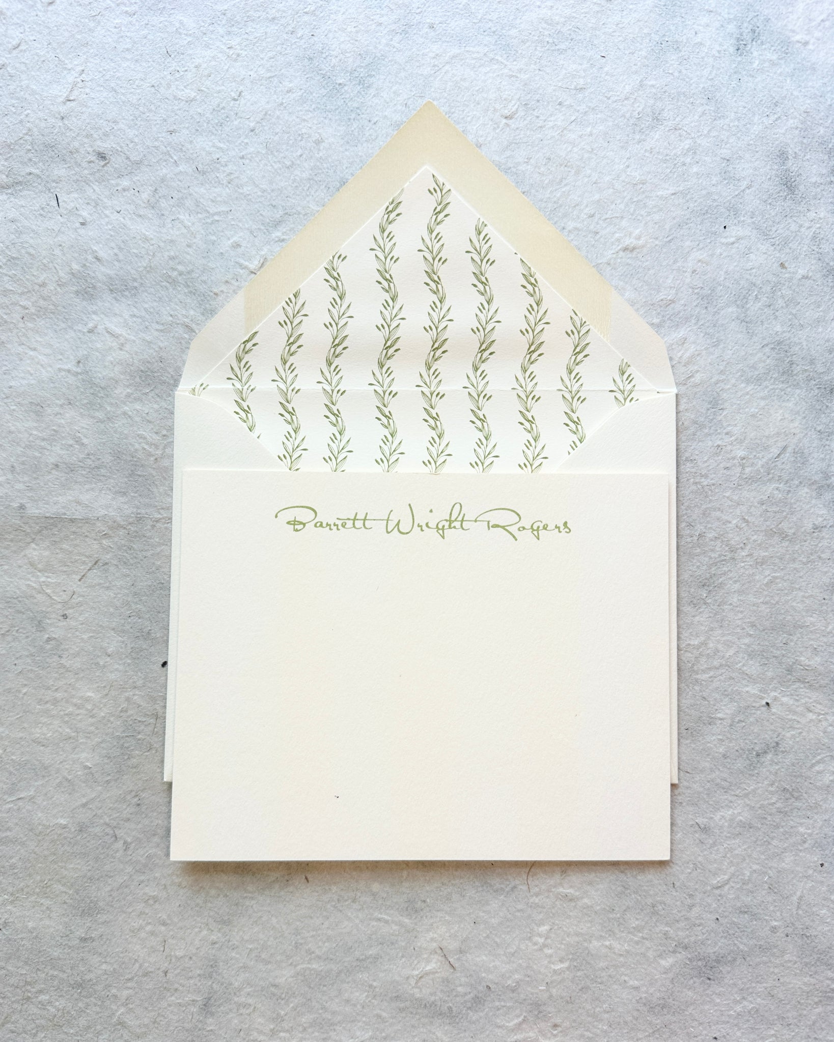 Classic fine stationery with raised thermography print and lined envelopes. 165# card stock #3 (5.5x4.125") size. Please include your personalization details in the special instructions section. Typestyles, print color, and liner will be as shown.