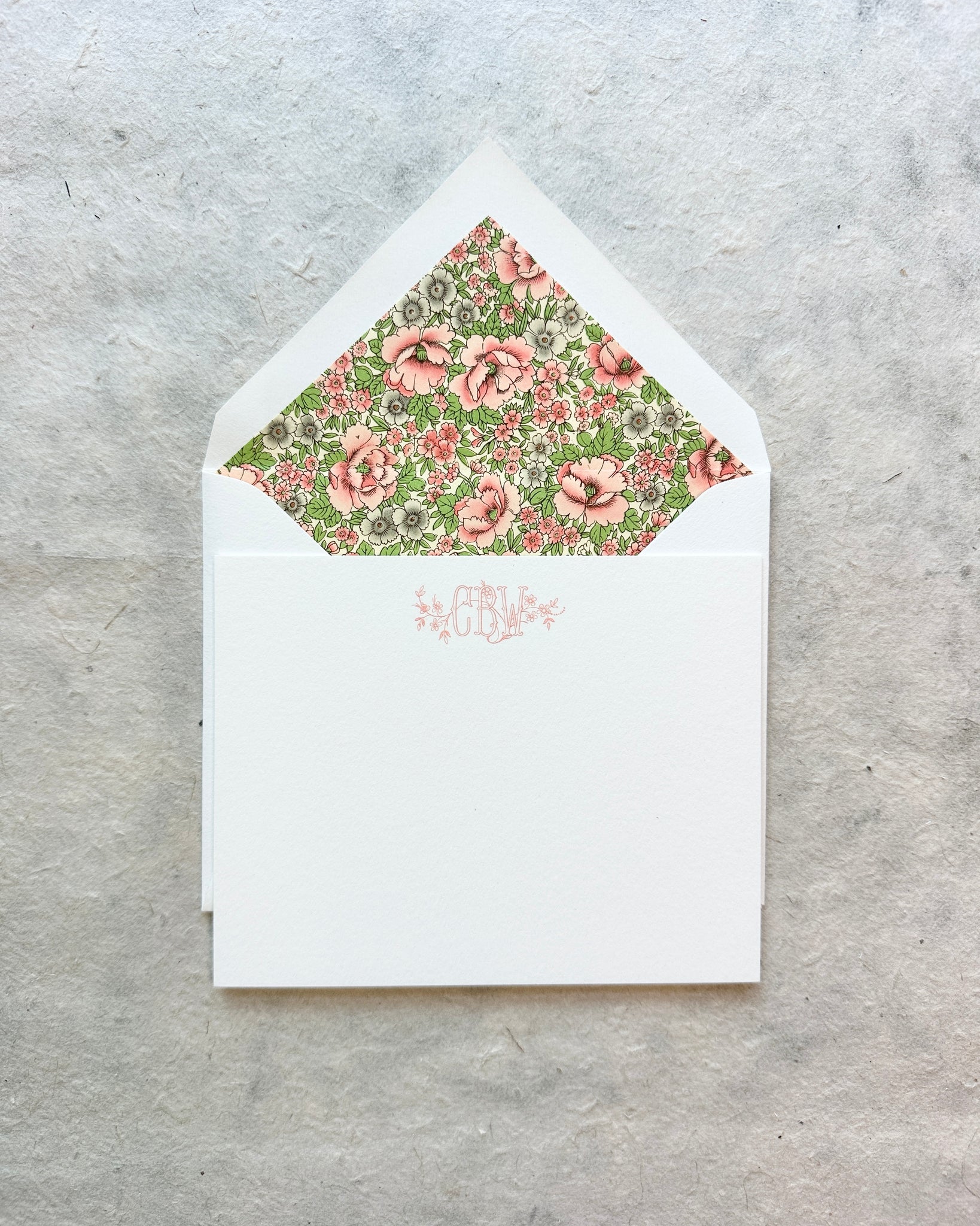 This beautiful engraved stationery with lined envelopes will elevate your written correspondence every time you use it. Orders will be shipped with copper plates for future printing. Please include your personalization notes in the "Special Instructions" section or feel free to text 601-982-0245 with any questions. You will receive a proof in 2-3 business days via email to confirm accuracy. Once the proof is approved please allow approximately 4 weeks in production. Personalization style and colors will be as shown or contact us for options to revise.