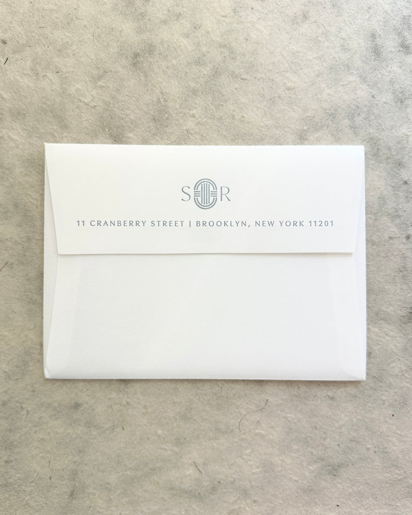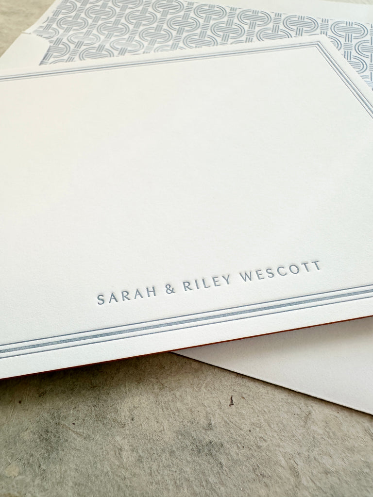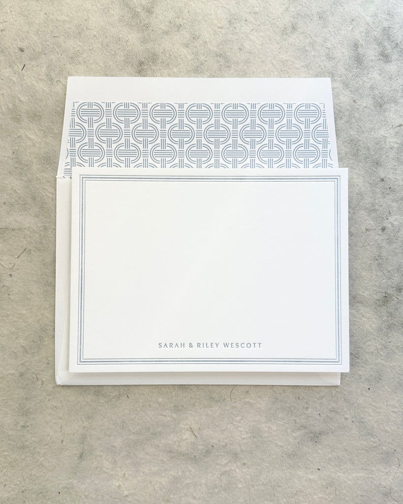 The Riley stationery design by Bella Figura features letterpress printing on a double thick, smooth cotton card. The envelope is lined in a complimentary pattern for interest and return address printing is included in the pricing.